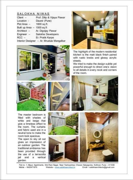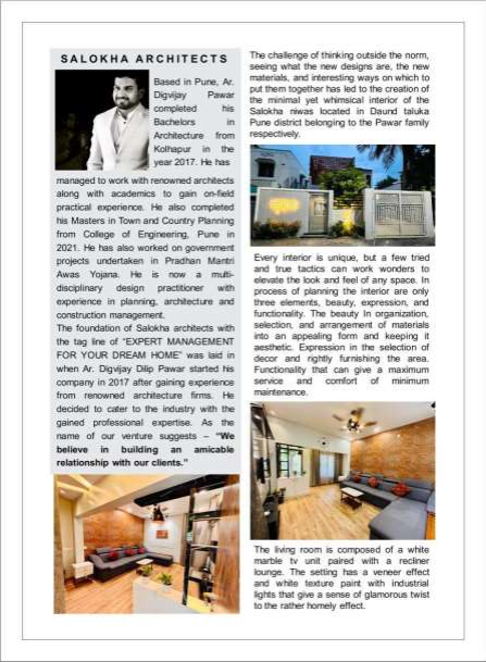 The foundation of Salokha architects with the tag line of “EXPERT MANAGEMENT FOR YOUR DREAM HOME” was laid in when Ar. Digvijay Dilip Pawar started his company in 2017 after gaining experience from renowned architecture firms. He decided to cater to the industry with the gained professional expertise. As the name of our venture suggests “We believe in building an amicable relationship with our clients.”.